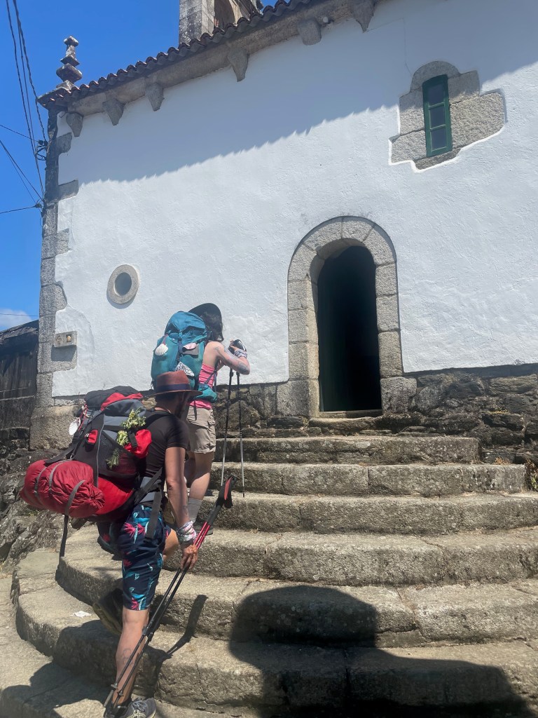Después de comer, seguimos más pesados por el descanso. Aún quedan cuatro horas para llegar. La salida del municipio es cuesta arriba y el sol golpea aún más fuerte. A Aurélie le duele más la cadera y Fred se ofrece a llevar ambas mochilas. Vamos lento. Nos adentramos en un sendero boscoso y llegamos a un café donde ellos deciden descansar. Para no perder el ritmo, sigo solo.
