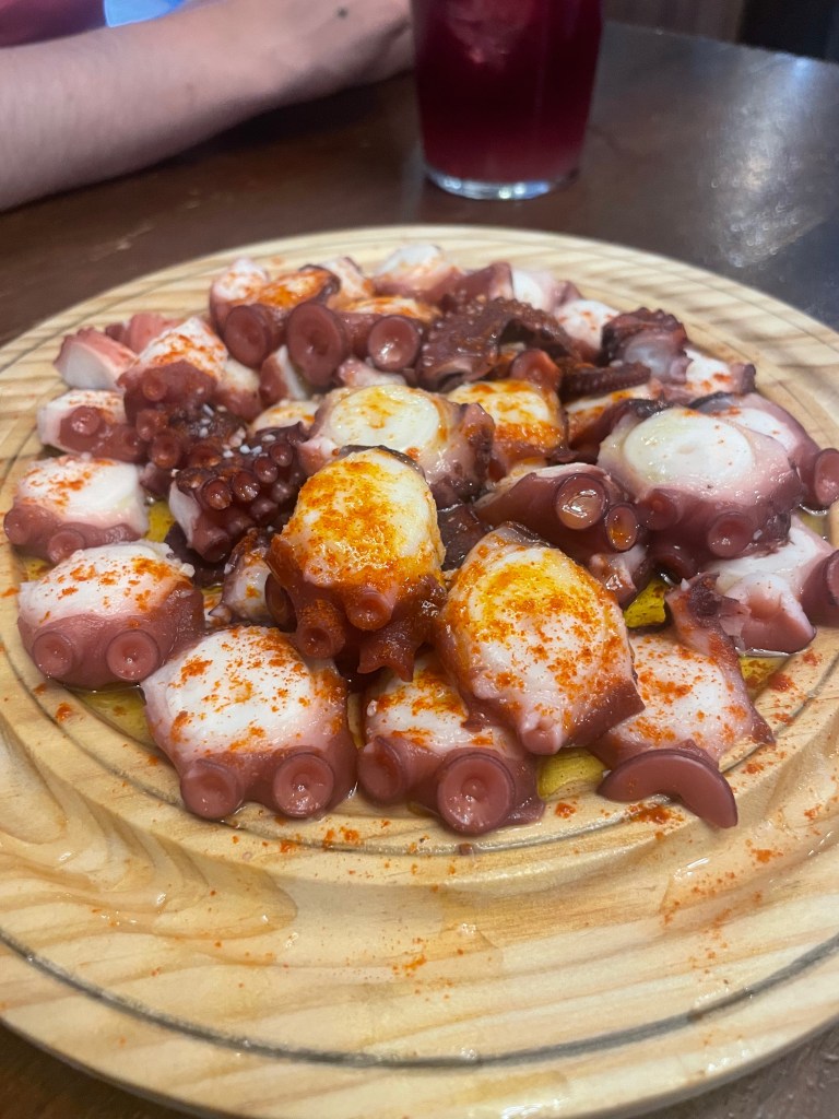 Hemos estado sentados tanto tiempo que mi cuerpo se enfría y me cuesta volver a ponerme de pie. Seguimos caminando juntos. El trayecto se hace más llevadero entre charlas. Nos detenemos un par de veces para que Fred tome fotos con su cámara analógica. Aurélie menciona que le duele la cadera. Es mediodía y el sol pega fuerte. Atravesamos un puente de piedra y llegamos a Melide, el municipio que marca la mitad de la etapa. Les propongo almorzar en un restaurante famoso por su pulpo a feira, una especialidad gallega. Los últimos pasos hasta la pulpería, bajo el sol abrasador y sin sombra, se hacen eternos. Finalmente llegamos y pedimos unas cañas mientras esperamos la comida.