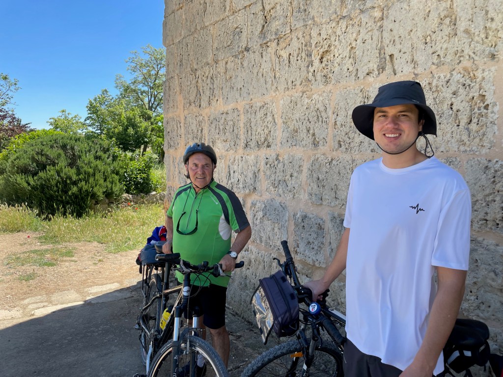 Finalmente, tras una intensa pedaleada, llego a Bocadillos del Camino, un pequeño pueblo donde encuentro a Argos esperándome en un banco. Vamos a la plaza a hacer una pausa. Apenas puedo mover las piernas al bajarme de la bicicleta. Aun así, estoy contento de haber llegado. Sé que falta para el destino final del día, pero necesitaba ese descanso. Entro al bar a comprar unas cañas y, al salir, me golpeo de frente con la puerta de vidrio. Derramo algo de cerveza, pero me apresuro a salir como si nada hubiera pasado.