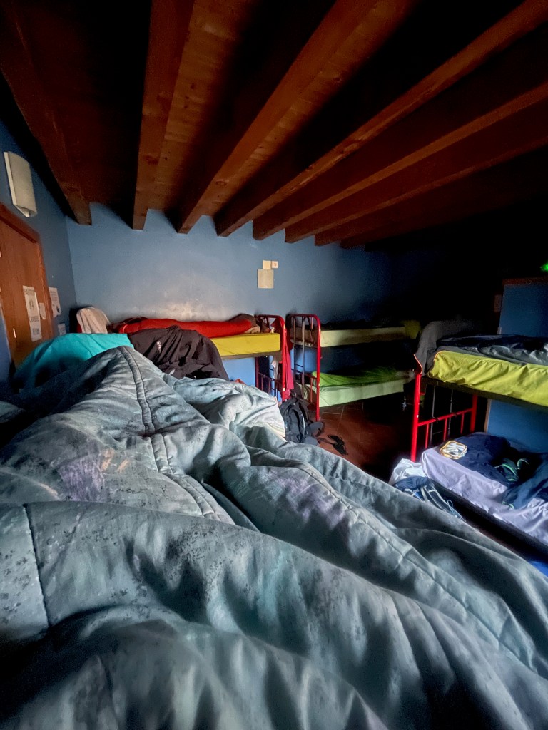Más tarde vamos a cenar con Argos. Al volver al albergue, le menciono que no vi sábanas en nuestro cuarto. Mi amigo, con seriedad, me pregunta si no traje una bolsa de dormir, evidenciando una vez más mi falta de preparación para el Camino. Ya me hacía a la idea de dormir con ropa, pero se me ocurre preguntarle a Carmen, la dueña del albergue, si puede alquilarme sábanas. Al ver que no traigo nada, me dice que me prestará una colcha suya. Son las 10 p.m. y todos ya duermen en el cuarto de 12 camas. La luz del sol sigue radiante en el cielo y caigo en cuenta de que hace días que no veo la oscuridad de la noche.