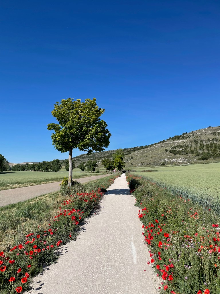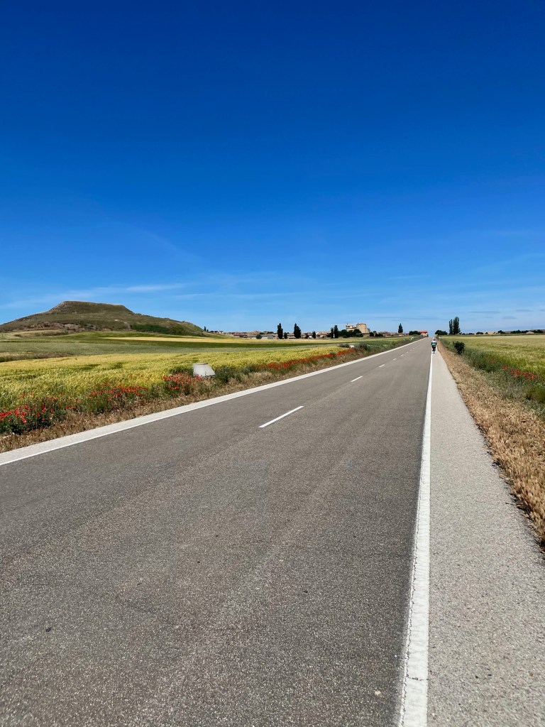 La segunda mitad es uno de los trayectos más difíciles que me ha tocado hacer en todo el Camino. Aunque vamos por asfalto, la carretera es interminable y, antes del viaje, no me había subido a una bici en todo el año, así que mi preparación física no es precisamente óptima. El sol está fuerte y no hay ni un árbol a la vista. Llevo el sombrero para no quemarme, pero el viento me lo pega en la cara y me quita visibilidad. Igual no importa. Voy a 2 km por hora. La pendiente es ligera pero infinita. No hay señales de bajadas. El paisaje está dominado por campos de trigo. Argos se adelanta tanto que lo pierdo de vista.