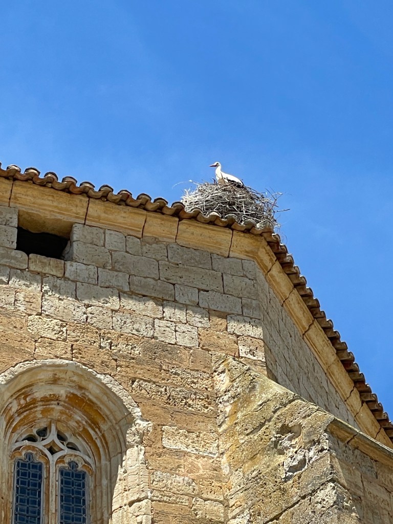 Cuando alcanzo a Argos en la plaza, lo encuentro mirando hacia arriba. Me dice que observe. El cielo está lleno de cigüeñas y una de ellas está por aterrizar en su nido. Nunca antes había visto una cigüeña. Es un animal imponente, y su nido no se queda atrás: una estructura colosal sobre el techo de la catedral.