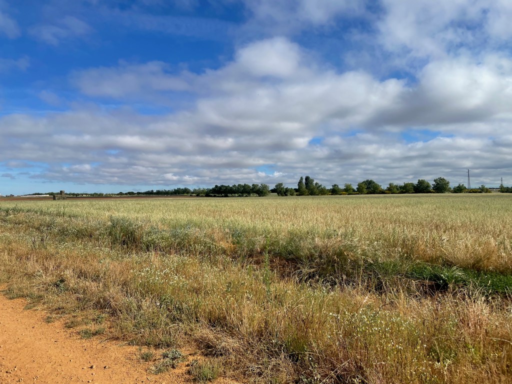 Ahora sí estoy listo para pedalear. Sigo el sendero entre los árboles hasta que, en determinado momento, me encuentro en un campo abierto que no se parece en nada al Camino. Me detengo y echo un vistazo a mi alrededor. A lo lejos, diviso una fina línea de árboles y las palabras de la señora resuenan en mi memoria. Inmediatamente modifico el trayecto y retomo el Camino.