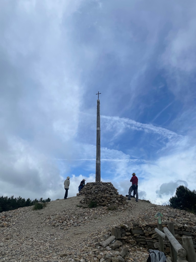 Pedaleamos y, a medio camino, Argos recibe una llamada. Se detiene, pero yo sigo para no perder el ritmo. Al cabo de un rato, entre la neblina, comienza a aparecer una gran estructura. Es la Cruz de Hierro. Mientras me acerco, escucho el sonido de un ukelele y alguien cantando Somewhere Over The Rainbow. Algunos peregrinos están sentados contemplando la cruz. Al llegar, veo montones de piedras con mensajes escritos apiladas junto a la base.