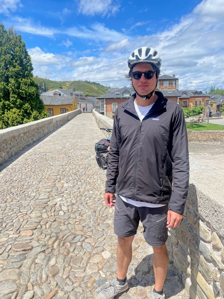 Tengo claro que hoy será un día mayormente cuesta arriba, al menos hasta llegar a la Cruz de Hierro. Luego, una gran bajada. Pedaleo lento pero constante, como en los últimos días. A ratos me bajo de la bici para caminar y descansar. Pierdo de vista a Argos un par de veces, ya que él sigue adelante mientras yo me detengo a estirar o comer algo. En algún momento decidimos tomar caminos diferentes; él prefiere la carretera. Me adentro en el Camino y poco después me encuentro pedaleando junto a otro ciclista que me había prestado su inflador antes. Charlamos. Me cuenta que es de Cataluña y trabaja en un banco. La pendiente vuelve a hacerse más pronunciada cuando nos acercamos a la carretera. Le digo que voy a parar a caminar un poco para recuperarme, y él sigue adelante.
